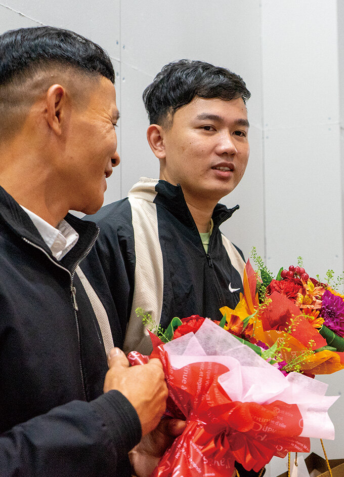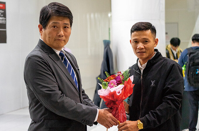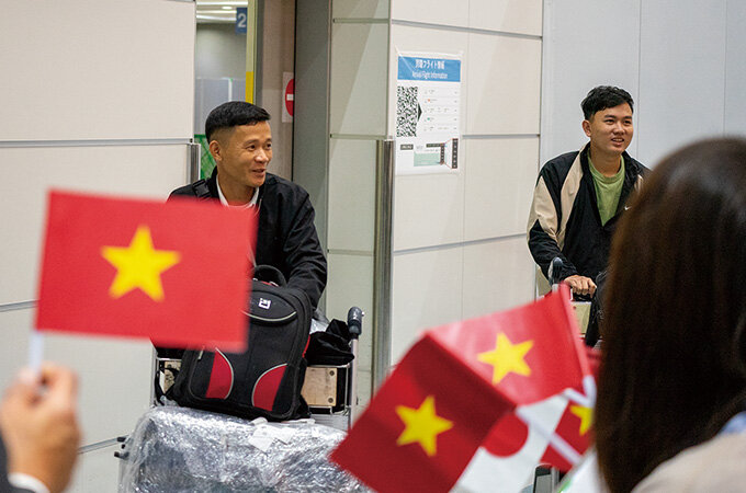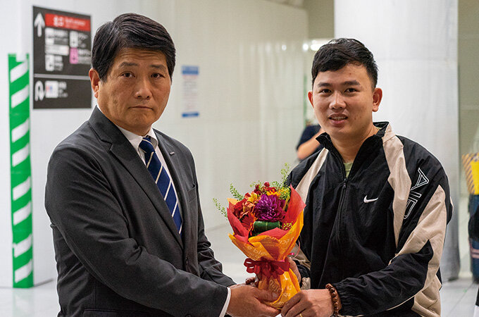 株式会社イマムラ(佐賀県鳥栖市)への就職が決まったベトナム人2名が、2024年11月7日に福岡国際空港に到着しました。来日したのは、キエウ ミン スアンさんとホ スアン チョオンさん。JACが支援し日装連がベトナム国内で実施している「内装仕上げ研修コース」の受講生です。受入れ先となる株式会社イマムラの小柳社長は空港に出迎え、「近年、日本人の採用が難しくなってきている。特定技能外国人の採用を通じて、日本の技術を伝えていきたい」と二人への期待を寄せます。日装連の椎津副理事長は、「会員により多くのベトナム人技能者を紹介できるよう組合として取り組んでいきたい」と、今後の方針を述べました。