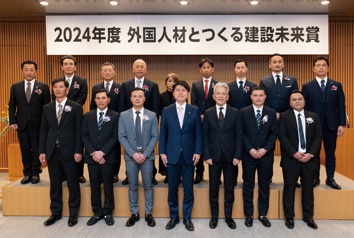 「外国人材とつくる建設未来賞(国土交通大臣表彰)」の授賞式が2024年12月24日に開催されました。技能やコミュニケーションスキルの習得が顕著な特定技能外国人、その育成に尽力された企業、また外国人材との接点を契機に新たな事業展開をされた企業の活動を表彰するものです。2023年度に続き、外国人材との共生社会の実現を目指した取組みが評価されました。