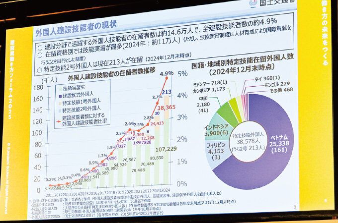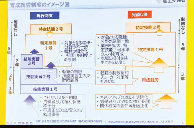 議論は2027年に始まる「育成就労制度」にも及びました。山本専務は「外国人一人ひとりのニーズに沿った育成プランの提供が今後ますます重要」と指摘。外国人が特定技能2号や技術者といった明確な目標を目指すうえで、必要な技能や資格を見据えた仕組みを企業と外国人が共有する必要性を訴えました。さらに「国交省には、この育成プランを実効性ある形で根付かせていただきたい」と要望しました。