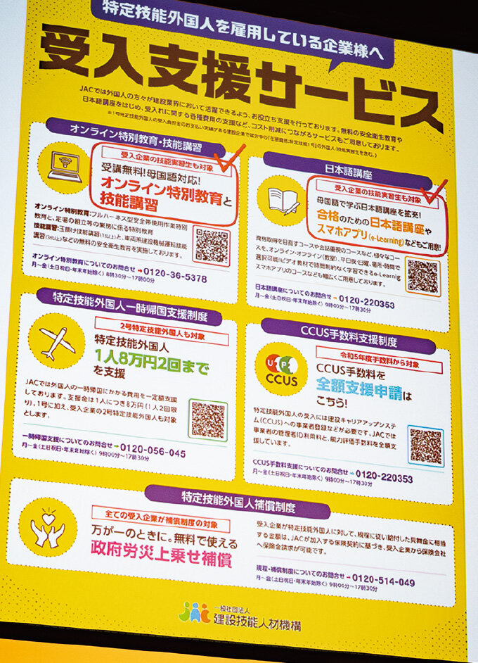 最後に山本専務は、海外現地でのスキルアップ研修や相談窓口の設置など今後の展開に触れつつ、「外国人の活用から活躍へ進むために、JACは教育・研修・制度支援を総動員して取り組みます」と結びました。セッションを通じ、外国人材が日本の建設業を支える存在へと成長できる環境づくりに向け、JACの強い意志が示されました。