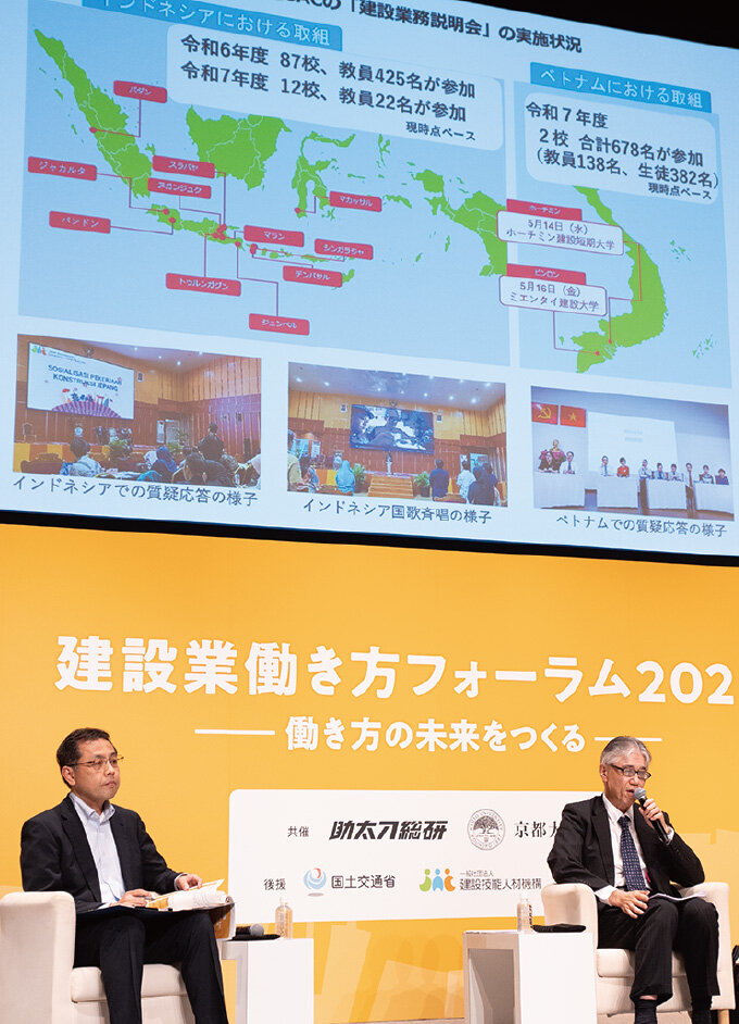 続いて山本専務は、海外での取組みにも言及。建設分野の賃金水準の高さ、安全対策の徹底、中長期キャリア支援という3つの魅力を現地で発信し、インドネシアやベトナムで説明会や研修を実施していると説明しました。こうした活動は学生や教員に直接訴求でき、日本を選んでもらううえで大きな効果があると語りました。