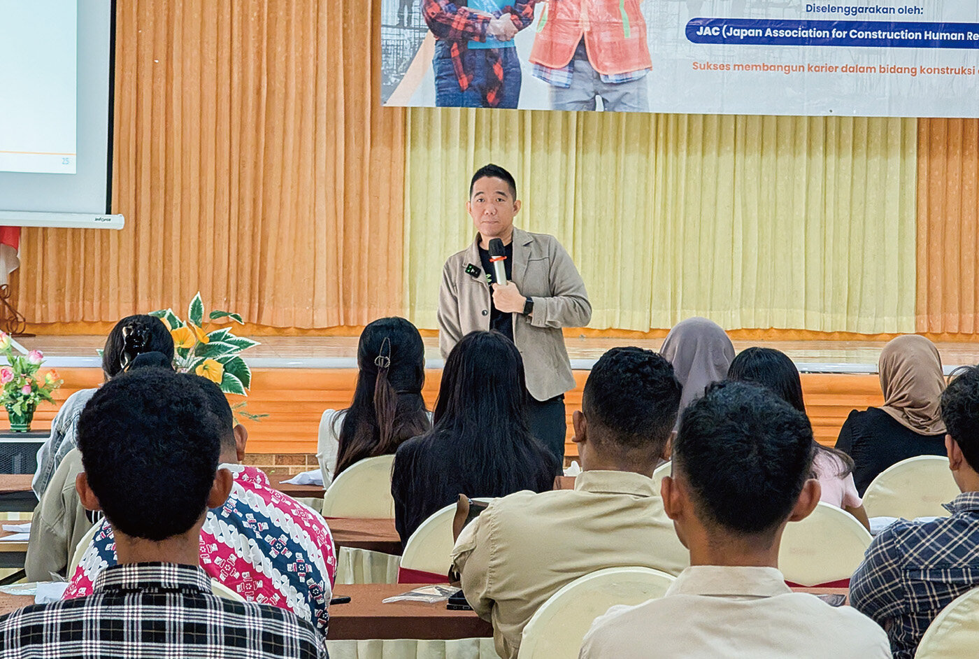 JACでは、インドネシア、フィリピン、モンゴル、ウズベキスタン、ベトナムの5カ国で建設分野の特定技能評価試験についての試験広報セミナーを現地チームと協力して実施しています。このセミナーは、日本の建設業界で活躍したいと願う現地の方々が、試験の概要や制度をより深く理解できるよう支援することを目的としています。9月に実施した3カ国3回のセミナーの様子を紹介します。